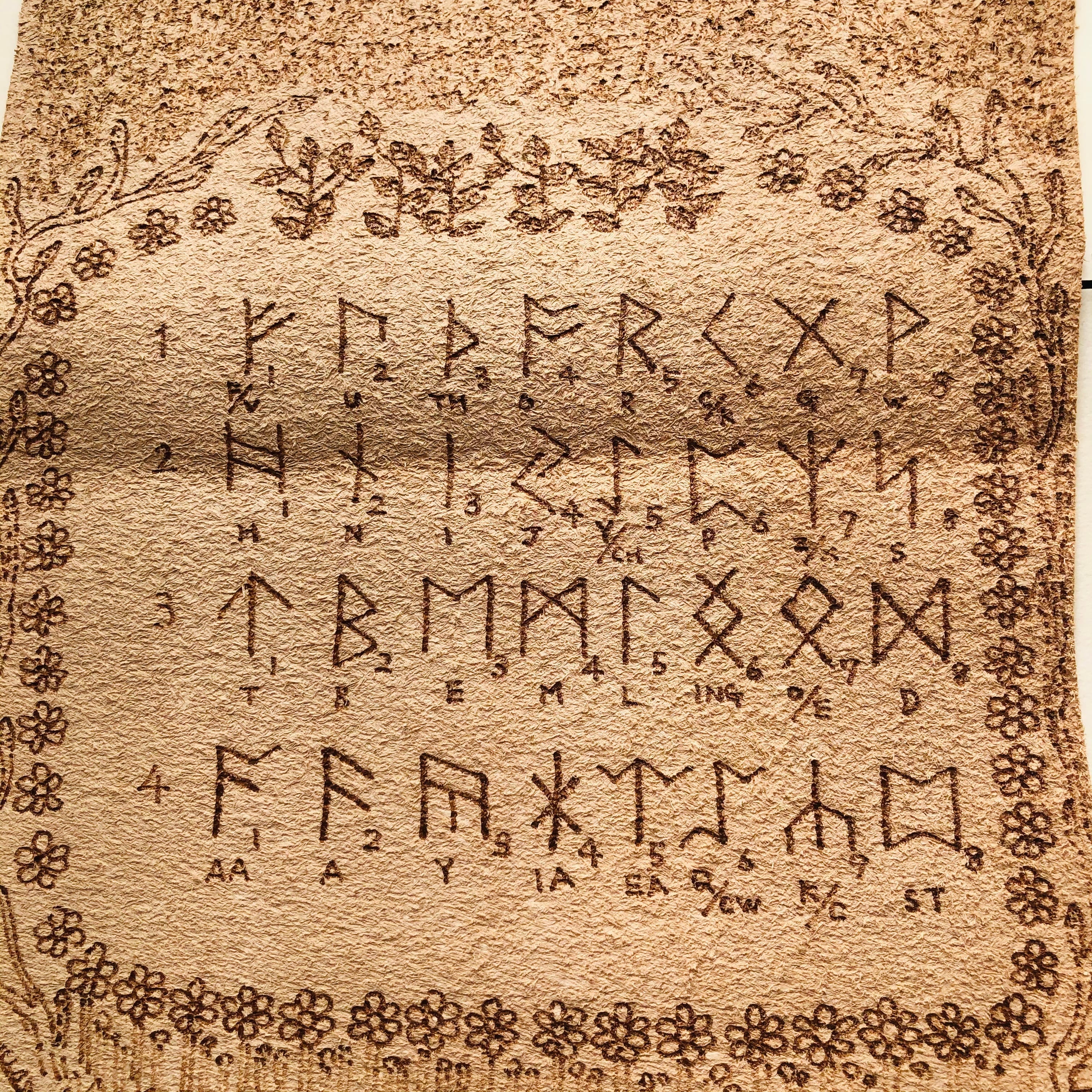 牛皮に電熱ペンで焼き付けて描くレザーバーニングです。