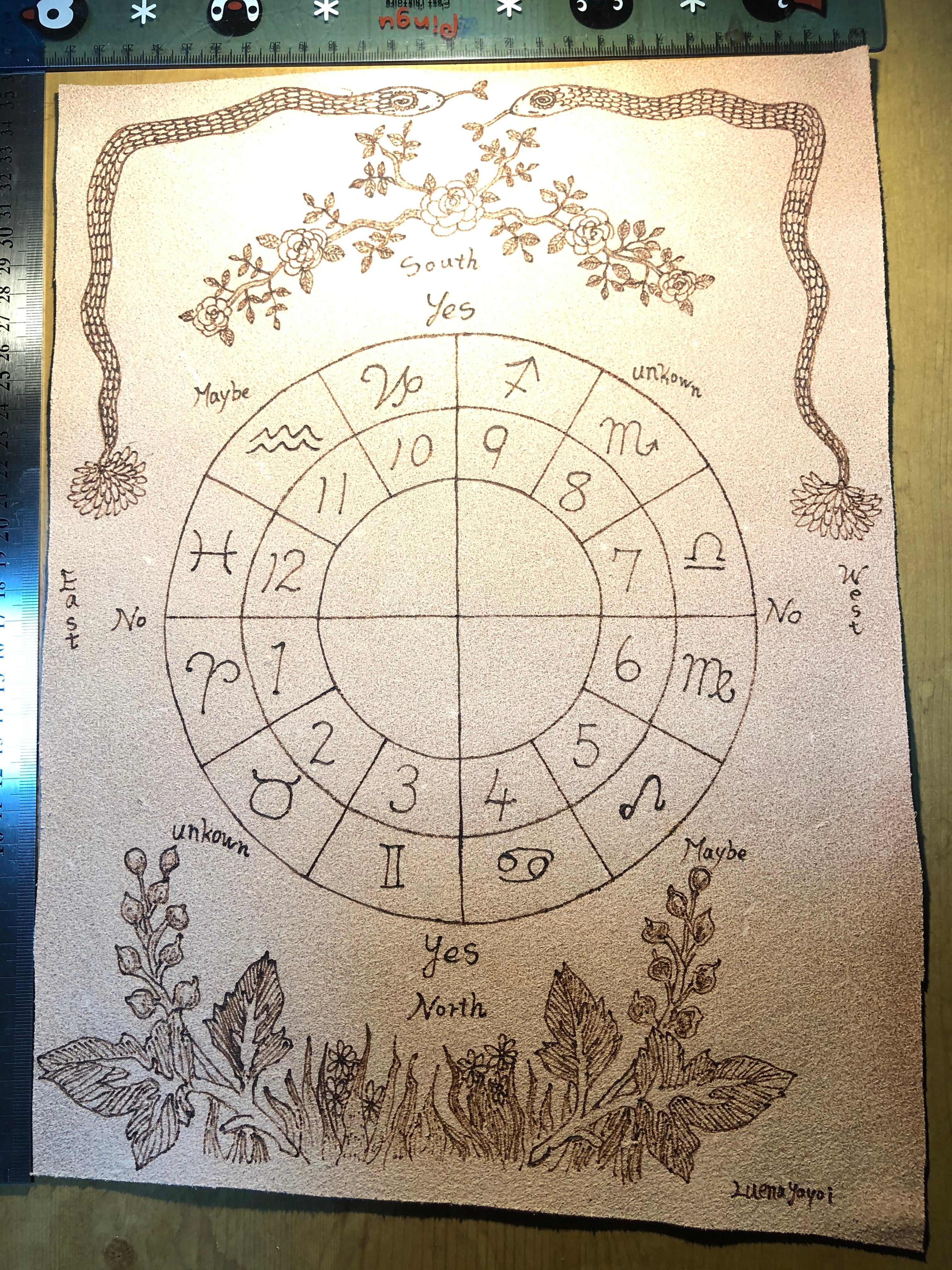牛革に電熱で焼き付けたレザーバーニングの技法で描いています。