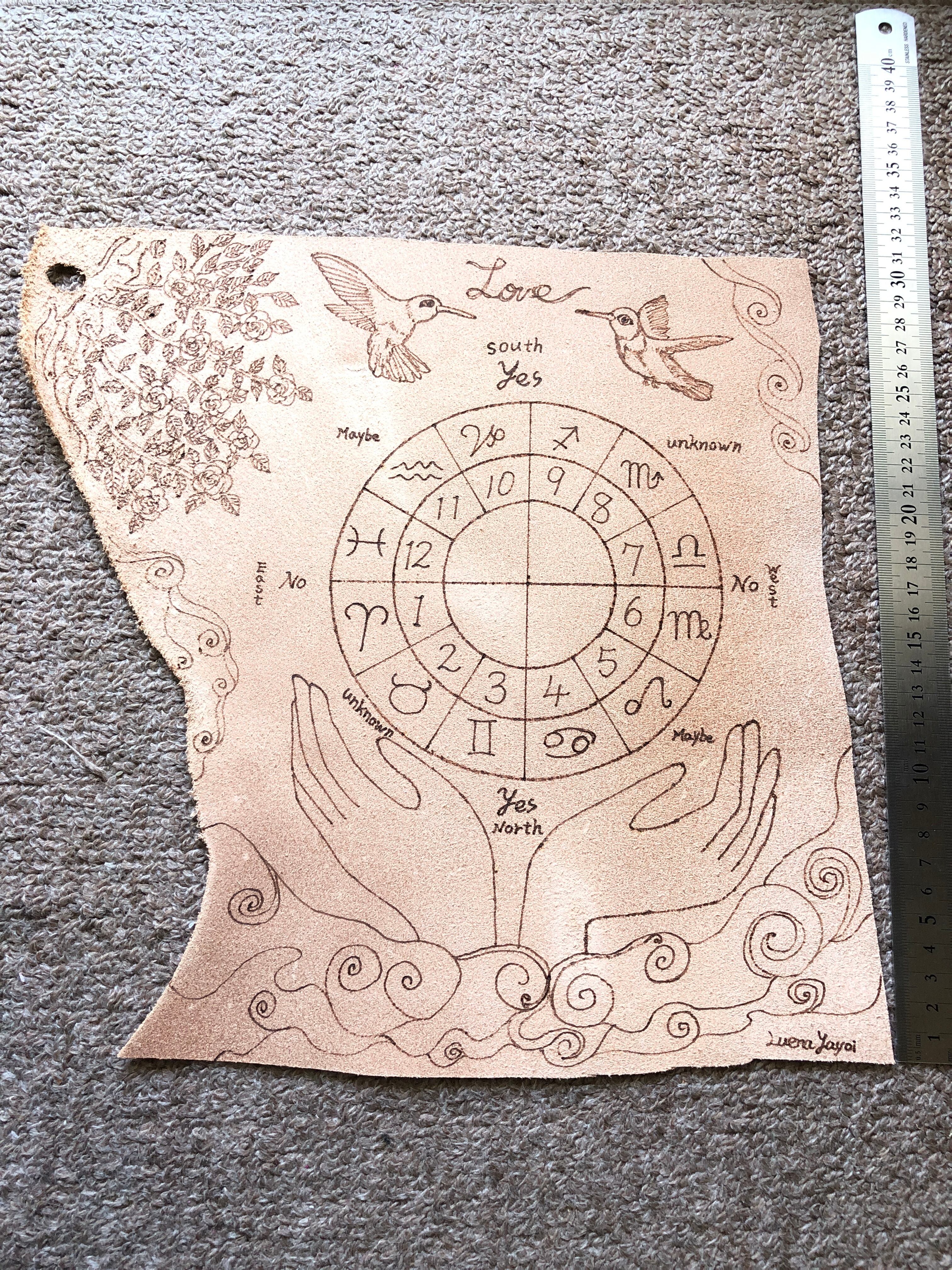 牛革に電熱で焼き付けたレザーバーニングの技法で描いています。