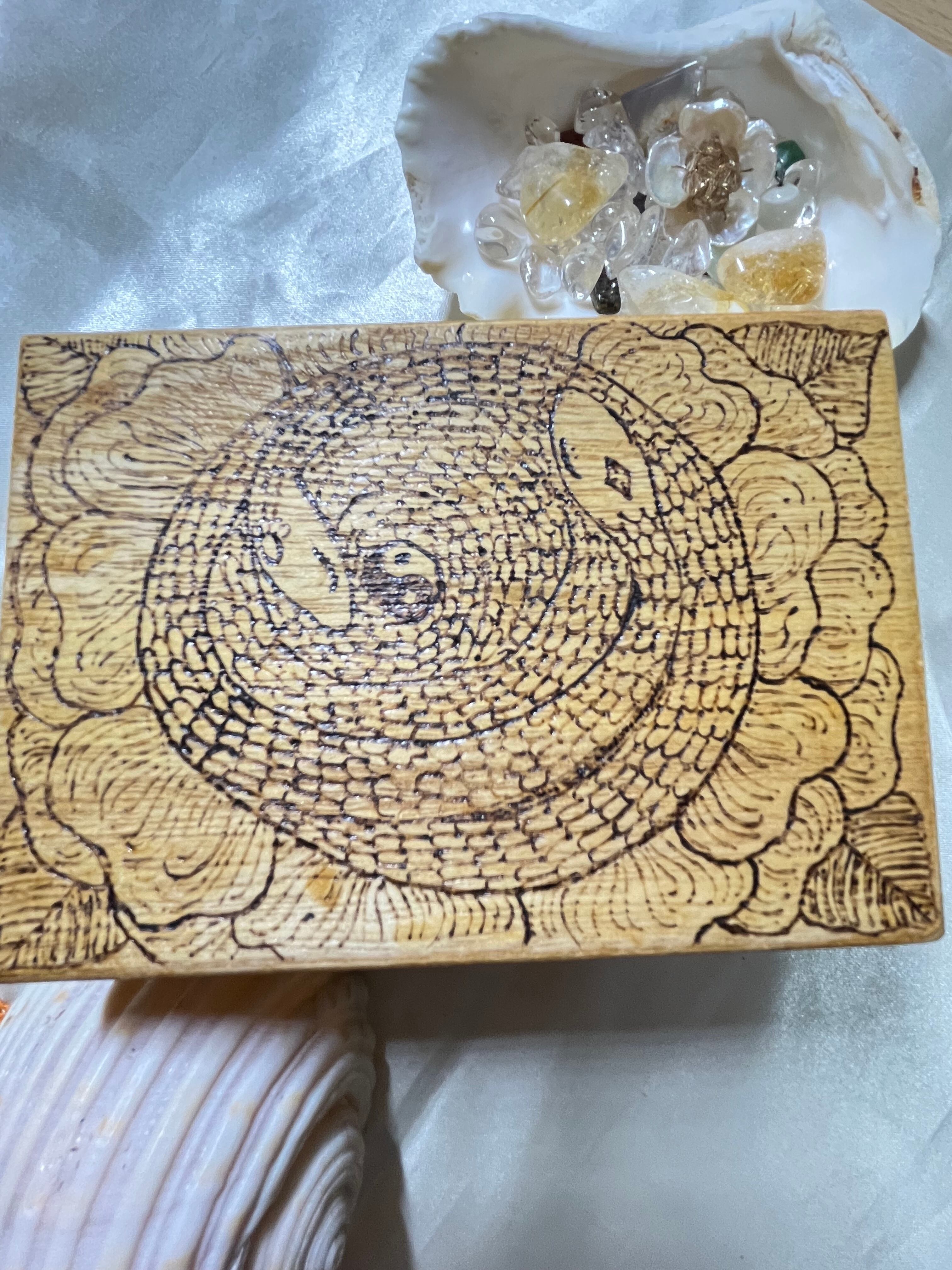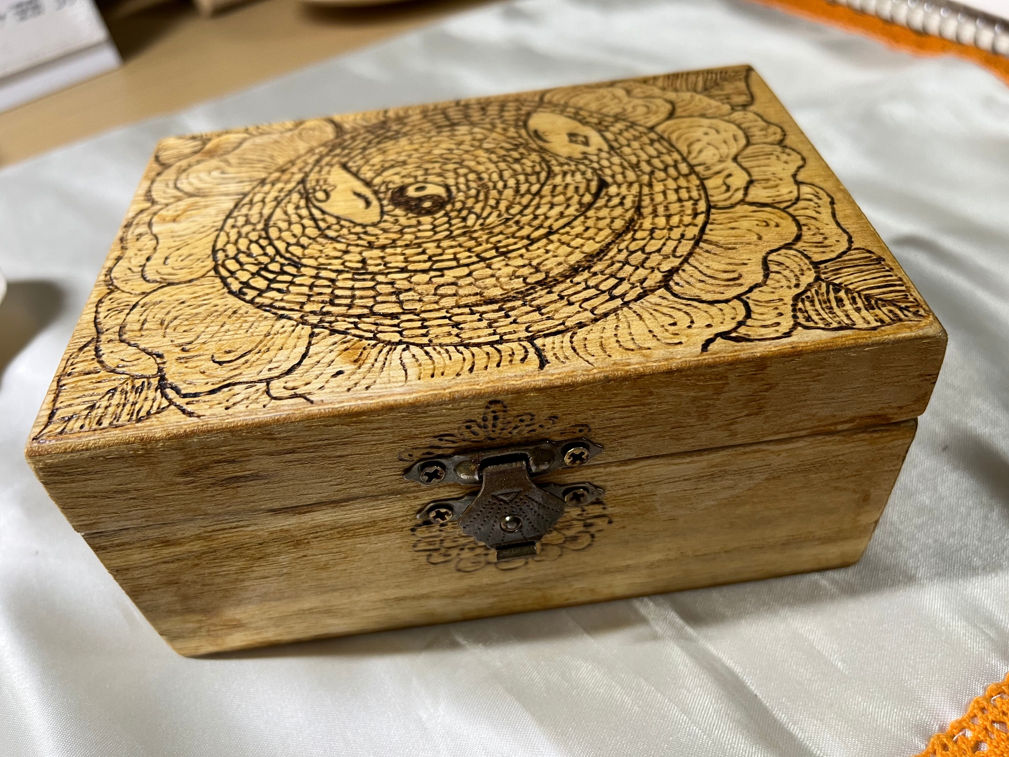 木箱にウッドバーニング。ニス仕上げ。